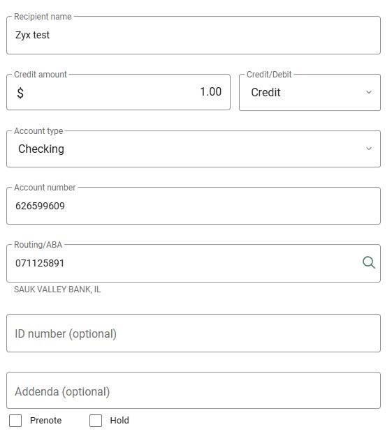 To create a prenote batch, check the prenote box when adding or editing a record on an existing batch.