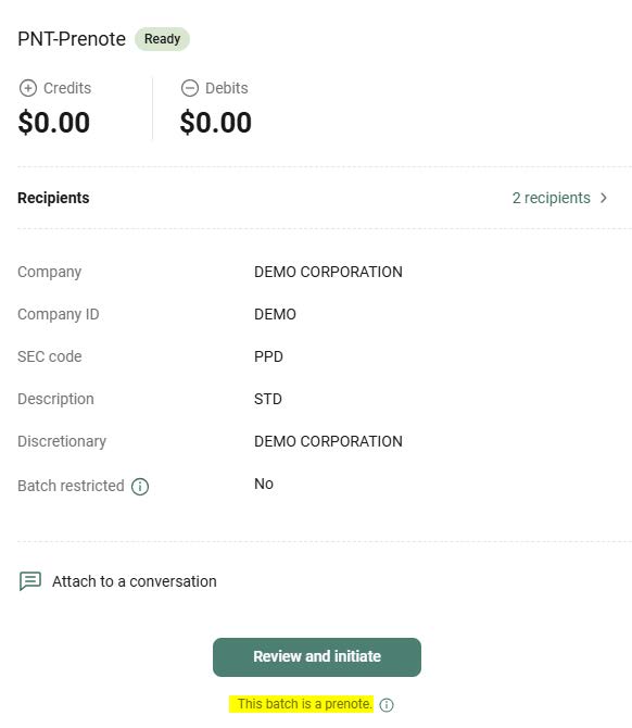 When the batch is created, a prenote batch will appear in the batch list. You will need to initiate the PNT-_______ batch to send the prenote.